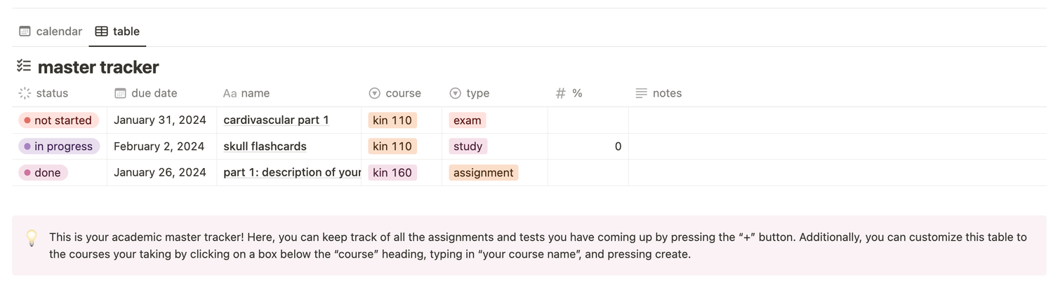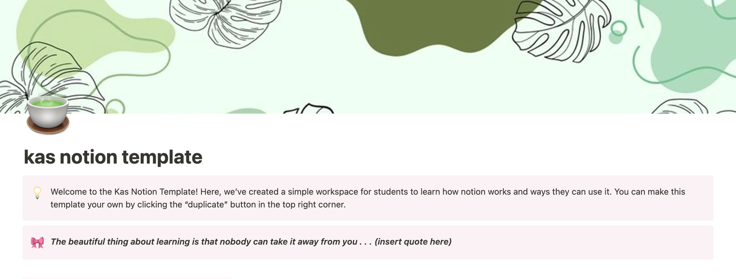 Ready to step up your set-up? We’ve created a KAS Notion template for beginners that you can use to stay on top of organization! Use this as your own personal website, where you can track all your deadlines, meals, expenses, and plan your week!