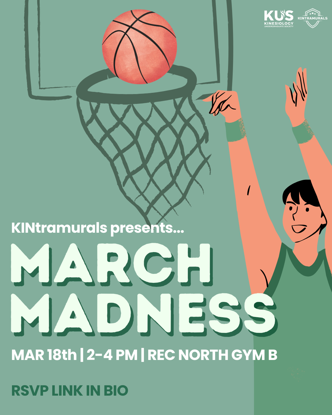 It’s time to channel your inner Steph Curry for KINtramurals March Madness! ⛹️♂️💨 Gather your squad for some high-stakes 3v3 action on the half-court with a playoff bracket too! 📈🔥