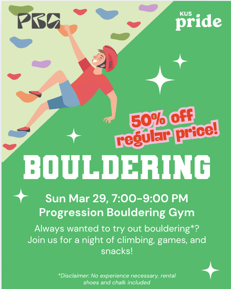 Have you ever wanted to try your hand at bouldering? Join KUS Pride at Progression Bouldering for a night of climbing (at 50% off regular price), games, and snacks!
