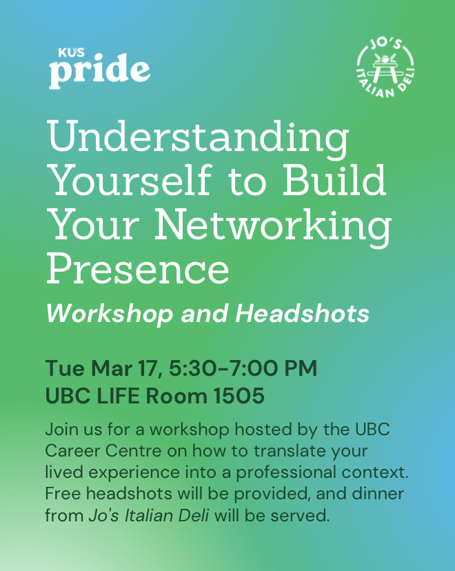 Join us for a workshop hosted by the UBC Career Centre on how to translate your experiences with student groups, like KUS Pride, into a professional context. Free headshots will be provided, and dinner from Jo's Italian Deli will be served.